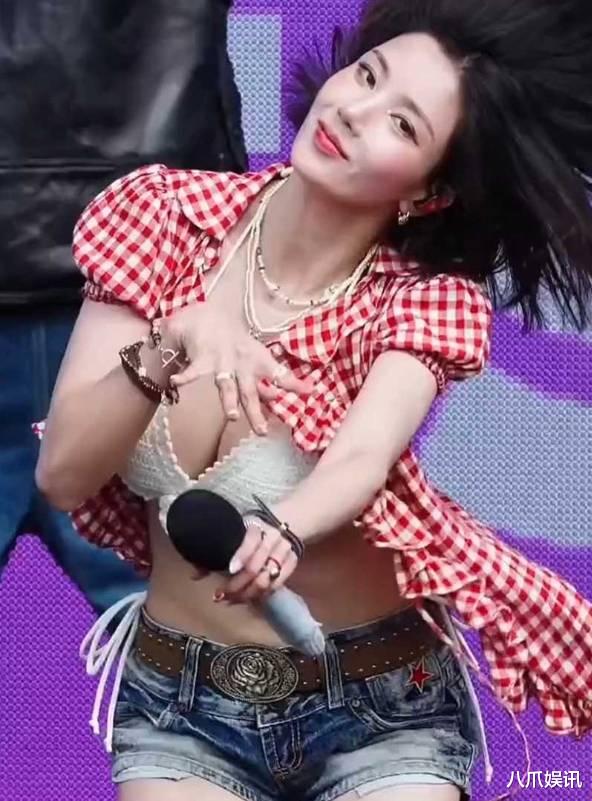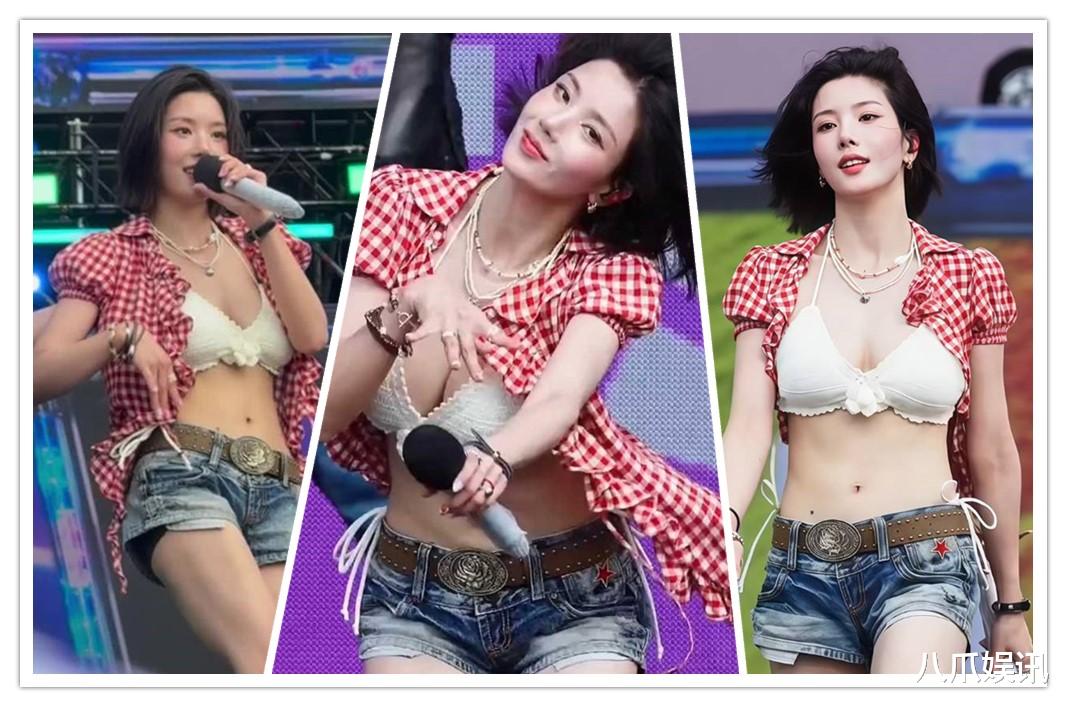 首尔夏夜的水花在震耳音浪中迸射,当聚光灯锁定舞台中央的权恩妃,2025 Waterbomb音乐节瞬间陷入沸腾。这位被媒体封为"水弹战神"的顶流偶像,以颠覆性造型点燃全场——荧光橙比基尼外罩解构式格纹衬衫,水浸后的布料紧贴起伏有致的腰臀曲线,牛仔热裤下笔直长腿随着《Crazy in Love》的鼓点高频律动。