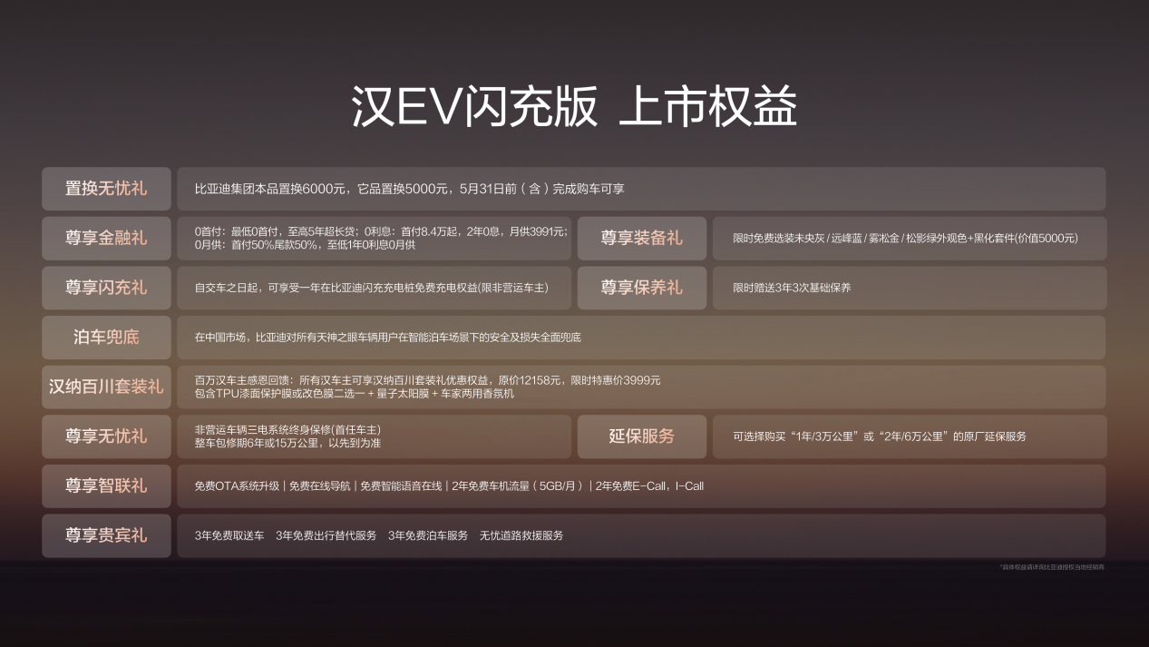 为回馈广大用户,比亚迪同步推出诚意满满的购车权益,涵盖置换无忧礼、1年免费闪充权益、0首付/0利息/0月供三选一金融礼、3年3次基础保养、3年免费取送车尊享贵宾礼等共11项专属福利。同时,针对追求个性化出行的用户,官方还推出价值超1.2万元的“汉纳百川”进阶生活套装,限时特惠仅需3999元,全方位满足用户多元化用车需求。
