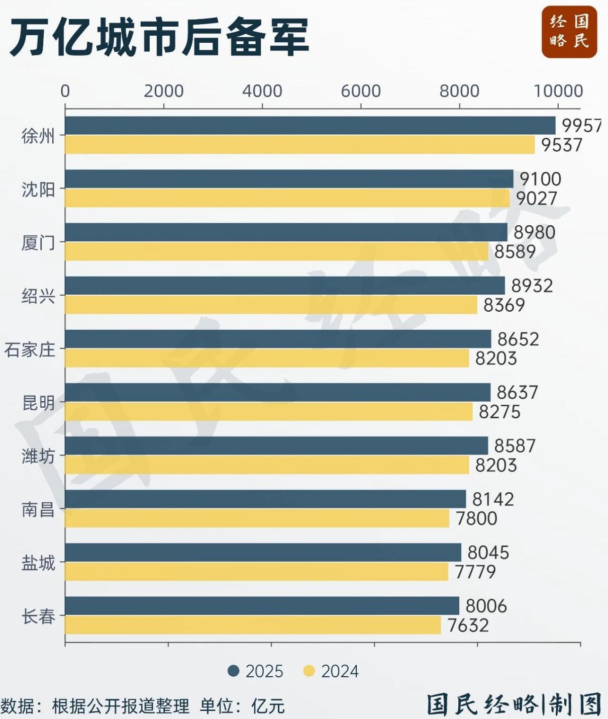 头号的种子选手,自然是临门一脚的徐州。徐州,9957.22亿元,2026年一定是稳稳进场。