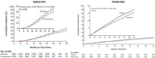 图2. 左:FIDELIO-DKD研究中,非奈利酮降低肾脏复合终点风险18%;右:FIGARO-DKD研究中,非奈利酮降低心血管复合终点风险达13%