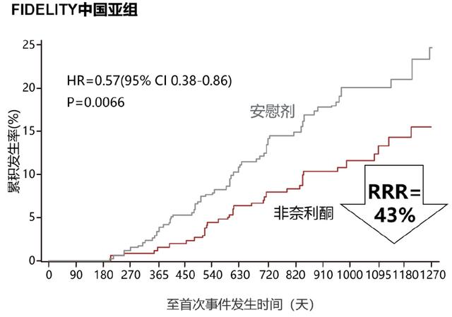 图3. FIDELITY中国亚组分析:非奈利酮使肾脏复合终点风险降幅达43%