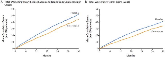 图4. 与安慰剂相比,非奈利酮使心衰恶化事件和心血管死亡复合终点风险降低16%,心衰恶化事件减少18%