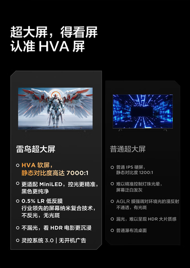 三款里面,最值得关注的就是配置最高的雷鸟鹤7 PRO 25款了!新品QD-MiniLED电视,采用了华星HVA屏幕,结合了独特的0.5%LR低反膜技术。华星HVA屏的亮点在于其对比度高达7000:1,相较于传统IPS屏的1200:1,对比度提升了整整6倍。这样一来,画面的细节更加丰富,特别是在黑暗环境中,细腻的层次感让观影效果十分震撼。加上与MiniLED技术的结合,雷鸟鹤7 PRO的控光表现非常优秀,几乎没有漏光问题,HDR效果也得到了充分的呈现,像我们这种周末喜欢我在家里追追剧、看看电影的人,真的很难拒绝!