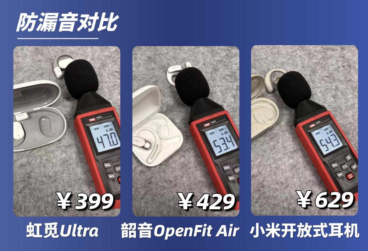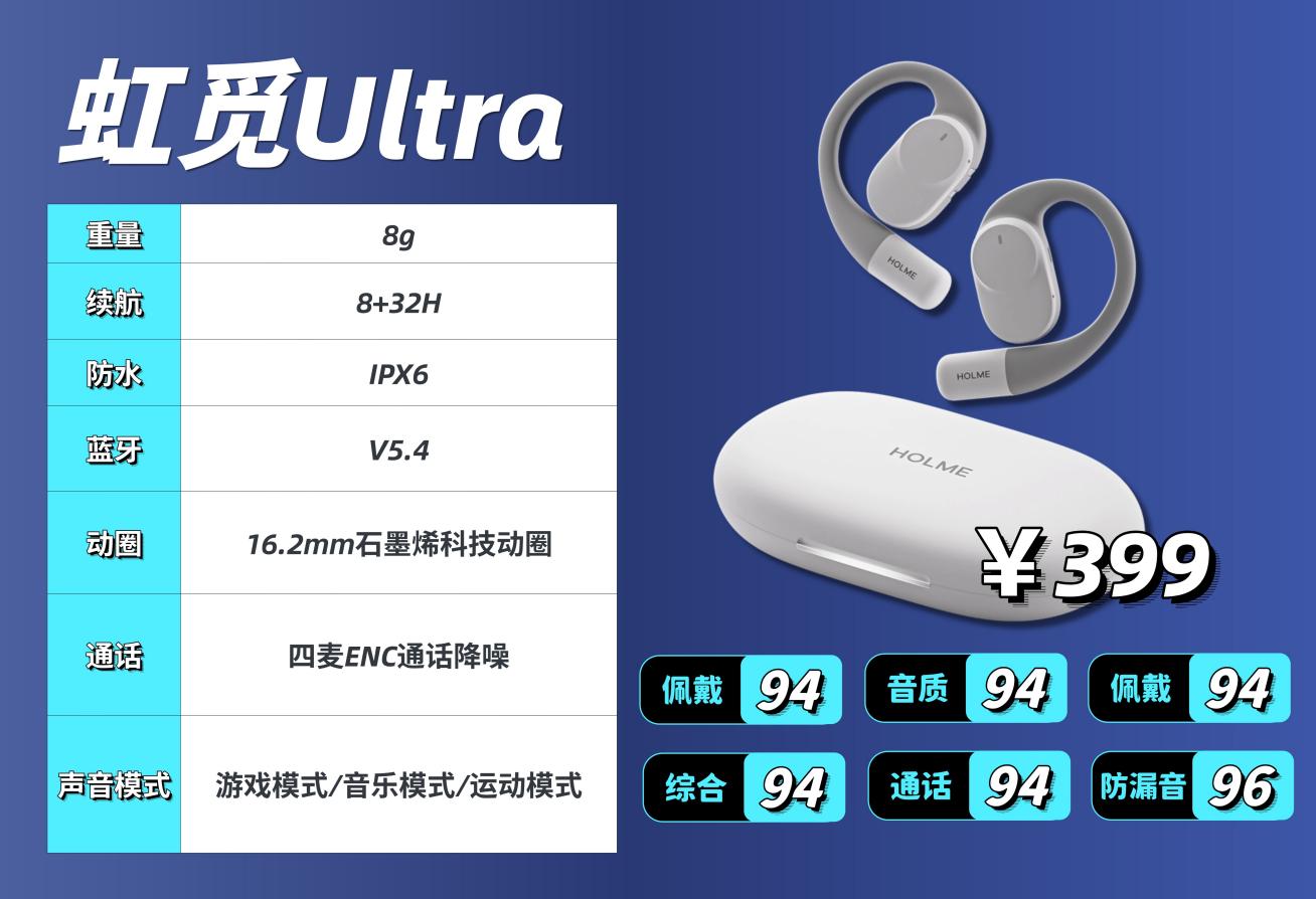 总结:虹觅 Ultra 是三款里综合性价比最高的一款,399 元价位带来最轻佩戴、稳定音质、靠谱续航与防水,还有独家防漏音功能,日常通勤、办公、宿舍使用都很合适,整体没有明显短板。预算有限、看重性价比、不依赖特定品牌生态的用户,选这款最稳妥。