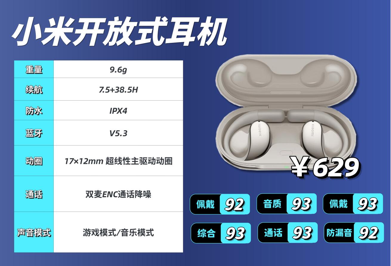 小米作为大众熟悉的消费电子品牌,音频产品更看重生态联动和基础实用性,品控稳定、适配性广,面向普通用户群体,主打均衡体验与设备协同。小米开放式耳机整体配置偏中庸,没有特别突出的点,也没有明显硬伤。蓝牙 5.3能保证基础稳定,但对比另外两款没有优势;单耳 9.6g,单次续航 7.5 小时、总续航 38.5 小时,总续航是三款里最长的,适合长期外出不方便充电的场景。防水同样是 IPX4,只能防轻微泼溅,双麦 ENC 在嘈杂环境下效果一般。这款耳机最大优势是小米生态联动,搭配小米手机、平板可以开盖速连、无缝切换、低延迟运行,非小米用户则无法体验这些功能。