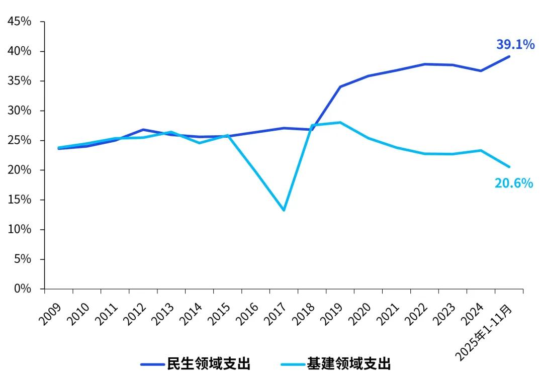 2026年政策将聚焦扩内需与促创新。在扩大内需方面,政策将强调投资于物和投资于人紧密结合,超长期特别国债将保持对“两重”、“两新”项目资金支持力度。同时,公共财政预算将进一步加大民生领域支出,提振居民消费意愿。预计教育、社保就业、医疗三项民生领域支出合计占比有望超过40%(图3)。在促创新方面,地方政府将积极利用好政策性金融工具与专项债资金,加大对新兴产业和未来产业的资金支持。同时,中央政府将提高公共财政中基础研究支出,促进重大科技成果高效转化应用。