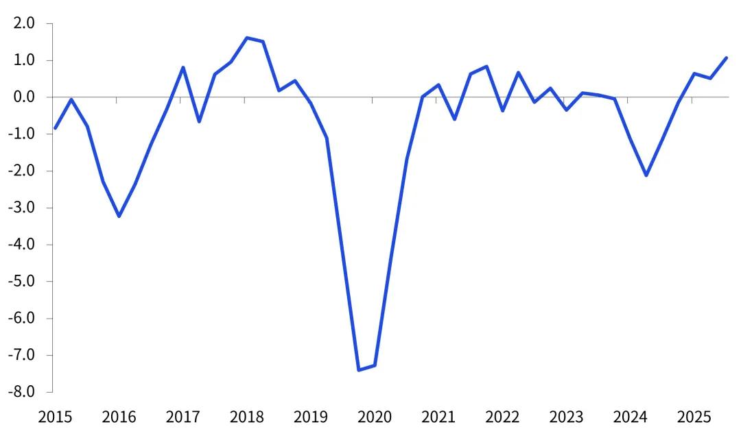 图10:中国香港特区服务净出口对实际GDP增长的拉动,当季值,百分点