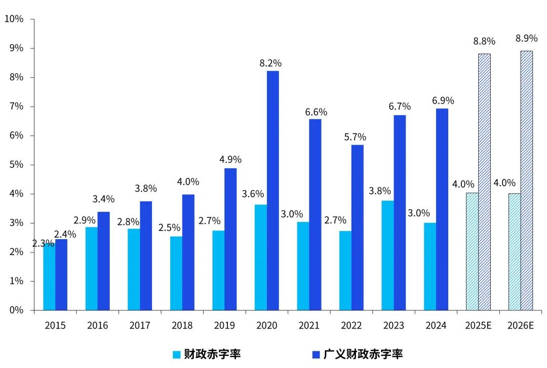 注:财政赤字率=(中央普通国债+地方一般债)/名义GDP。广义财政赤字率=(中央普通国债+中央超长期特别国债+地方一般债+地方专项债+年中动用债务结存限额)/名义GDP。