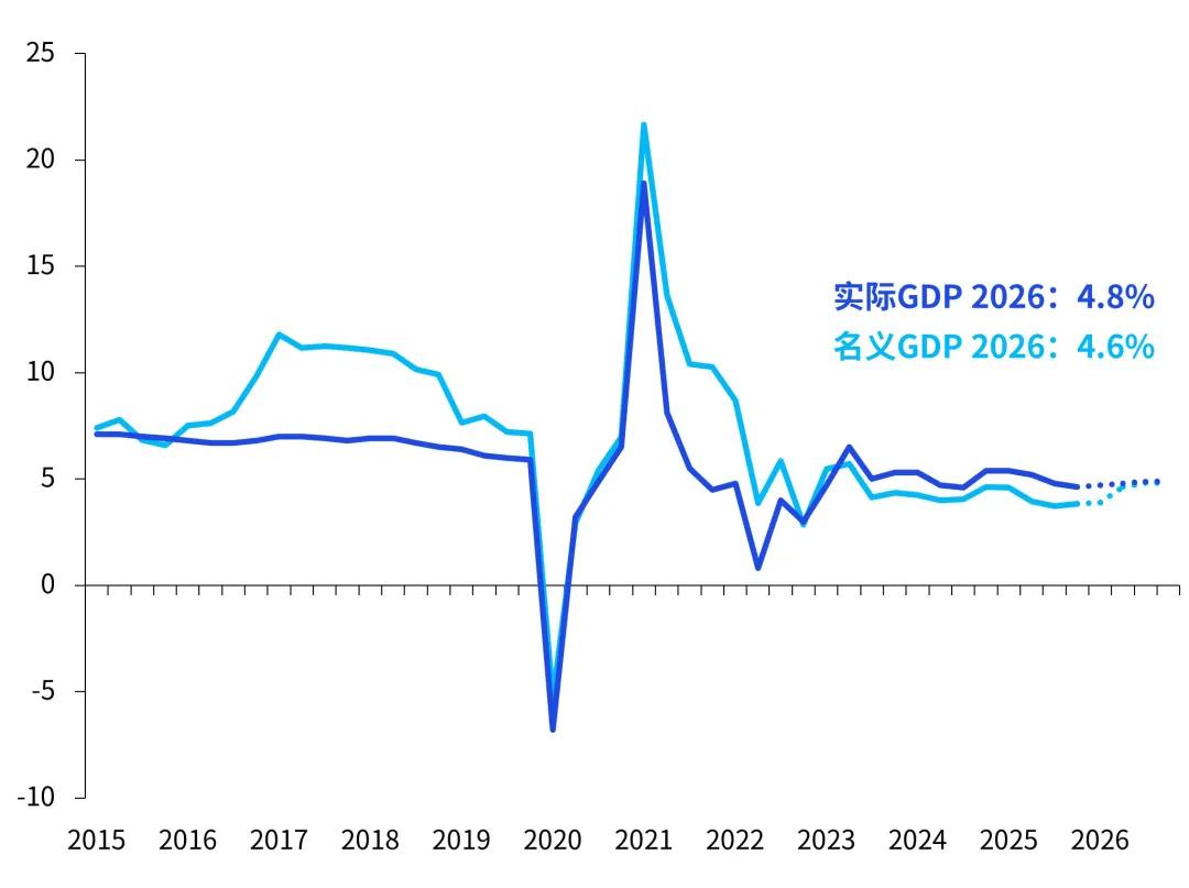 伴随稳增长、扩内需政策与“反内卷”政策形成合力,我们预计2026年中国经济实际增速将达到4.8%左右。与此同时,物价表现有望从“止跌企稳”进一步转向“温和回升”,名义经济增速将上行至4.6%左右,经济供需温差有望加快弥合(图1)。