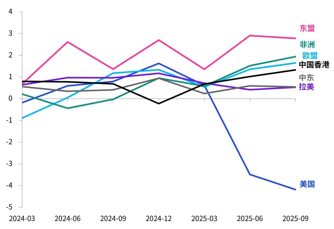 8.做大做强“中国人经济”,拓展跨境贸易和投资新领域2025年在全球贸易保护主义的逆风中,中国出口展现出超预期的韧性,上半年占全球出口份额为14.2%,创历史同期新高;前三季度出口同比增速逐季走强,成为经济增长的重要支撑力量。一方面,中国积极开拓非美市场取得显著成效,对非美市场出口表现强劲,有效对冲对美出口下滑的拖累(图9)。另一方面,全球人工智能及新能源产业加速发展,叠加中国高端制造产品的竞争优势不断强化,集成电路、“新三样”产品出口拉动作用明显。展望未来,随着10月中美吉隆坡经贸磋商就双方关税政策及管制措施达成多项共识,美国取消10%对华芬太尼关税,并继续暂停24%对等关税一年,有助于中国外贸环境边际改善。在全球财政和货币政策宽松预期下,外需有望维持一定韧性。预计新兴经济体需求扩张与中国高技术产品竞争优势,将继续支撑2026年出口稳健增长。
