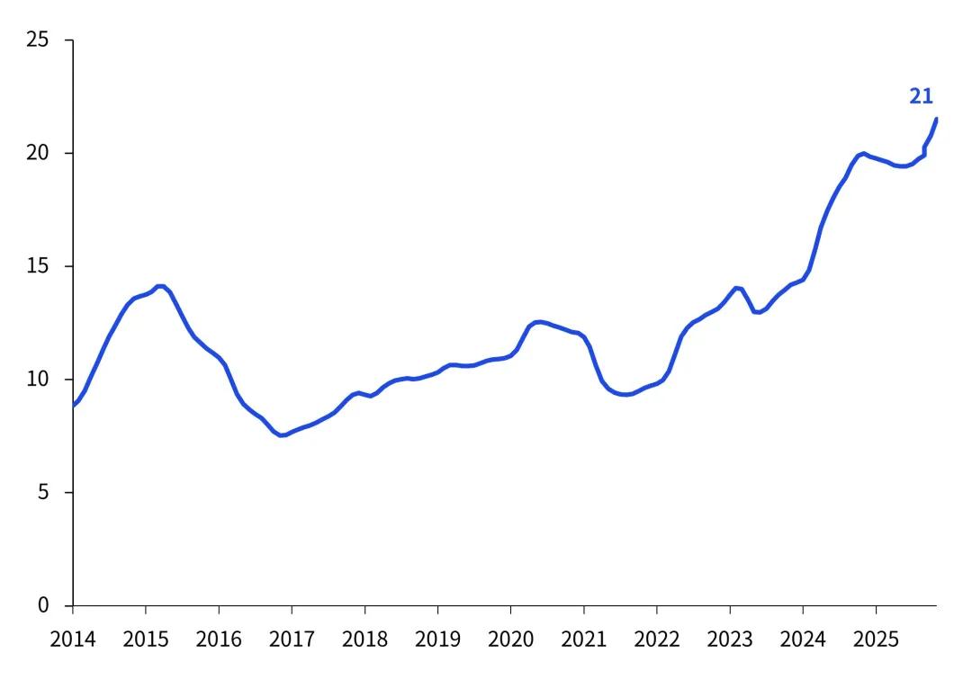 7.房地产发展逐步进入新稳态,关注中央政府收储动向自2021年我国房地产进入下行周期以来,房地产需求与供给同步收缩。2025年前11个月,住宅商品房销售面积、投资完成额仅为2021年同期的48%、62%。当前房地产市场依然处于供过于求的阶段。从房价表现来看,截至2025年11月,新房、二手房房价指数分别较2021年8月的高点回落12%、21%。从库存表现来看,2025年商品房待售面积同比仍为正增长,2025年末十大主要城市库销比仍然高达21个月,处于历史高位(图8)。持续下行的房价使得购房者普遍存在观望情绪,进一步压制购房需求,而高库存则制约房地产企业的投资意愿。预计2026年地产销售、投资内生修复动能有限,销售、投资仍面临较大下行压力。