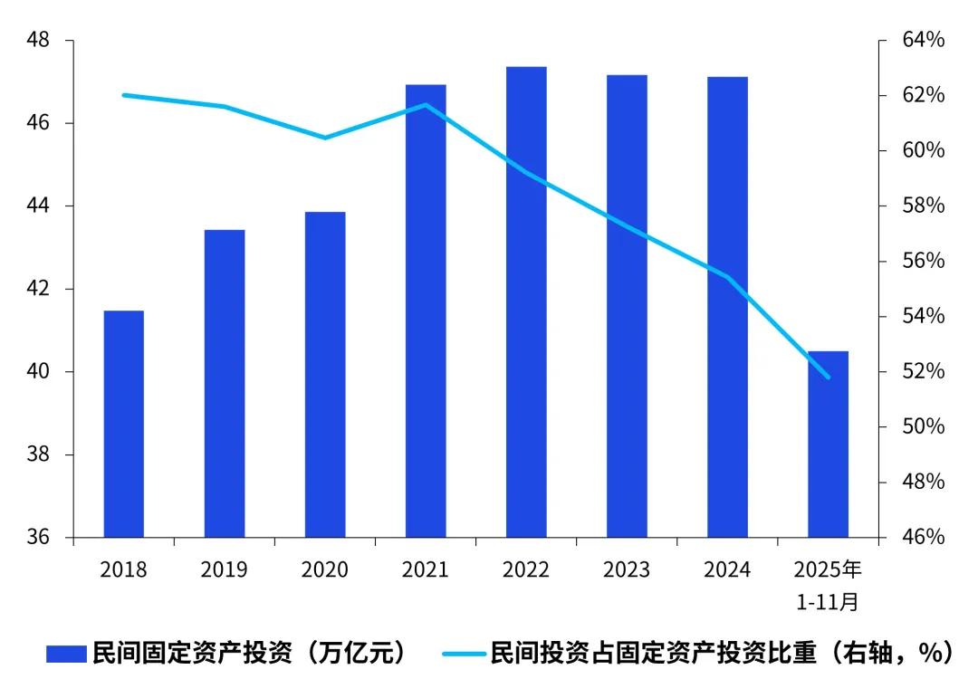 二是民间资本在基建项目中参与度将有所提升。长期以来,以民营企业投资为主的民间投资是中国固定资产投资的重要部分,2021年以前,其投资规模占比超过60%,是推动投资增长的重要动力。但近年来,由于房地产市场下行等因素影响,民间投资不断走低,且在“反内卷”政策影响下,今年前11个月民间投资占比已跌至52%(图7)。为稳定民间投资对经济的支撑作用,11月中旬,国务院印发《关于进一步促进民间投资发展的若干措施》,提出13项举措提振民间投资,其中包括鼓励民间资本参与有收益的铁路、核电、水电、油气管道等国家审批的重大建设项目,以及鼓励其参与规模较小、具有盈利空间的地方城市基础设施领域新建项目建设。这一举措一方面有望让民营企业参与并分享重大基础设施长期收益的机会,能够盘活前期因房地产、“反内卷”影响而闲置的民间资金。另一方面,近年民营经济创新能力持续增强,民营资本参与传统基建项目运营,有助于推进基建领域数智化转型进程,提升运营效能。此外,增扩基建项目中的民间资本占比,将释放部分政府财政空间,政府将有余力将更多资源用于涉及长期发展但收益偏低的公益性项目。