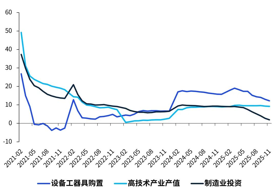 2026年制造业投资表现受四方面原因支撑。首先,企业面临更加稳定的政策环境,投资意愿回暖。海外方面,美国贸易政策不确定性降低,前期盈利能力偏弱,受关税影响较大的劳动密集产业投资情绪有望回升;国内方面,“反内卷”政策进入细化落实阶段,大范围缩减产能等政策预期逐步消退,企业前期积压投资需求将根据市场需求逐步释放。其次,传统制造业企业进入转型加速期,产业升级投资需求回升。“十五五”规划《建议》明确,要推动技术改造升级,促进制造业数智化转型,发展智能制造、绿色制造、服务型制造。另外,《国务院关于深入实施“人工智能+”行动的意见》明确,到2027年要实现人工智能与产业发展的深度融合。传统产业的智能化升级改造或将集中在2026、2027两年进行。伴随2026年设备更新补贴持续投放,传统产业设备更新等技术改造投资需求有望保持较高热度。第三,在“十五五”规划《建议》提出“以新供给创造新需求”的指导思想下,新兴产业将加大技术创新力度、加快创新成果转换节奏。预计制造业产品迭代周期将逐步缩短,为新兴产业持续创造增量投资空间。第四,关注人工智能产业对制造业投资的带动作用。人工智能既是当前全球科技竞赛的集中领域,也是“十五五”时期新兴支柱产业的重要组成部分。中央经济工作会议指出要深化拓展“人工智能+”。伴随政策性金融工具加大对人工智能项目支持、海外科技企业持续增加人工智能领域资本开支,2026年我国算力设备、硬件设备、电气设备等高技术产品面临同步走强的内外部需求,其所在高技术制造业投资对总体投资拉动作用将较2025年进一步提升。