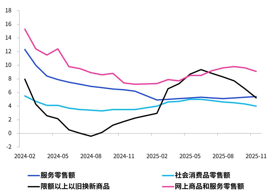 3.消费保持平稳增长,服务消费是重要拉动力在消费品以旧换新、扩大服务消费等系列促消费政策驱动下,消费成为2025年拉动经济增长的主引擎。值得注意的是,2025年下半年以来,随着大部分传统大宗消费需求已经释放、以旧换新政策带动作用减弱,叠加居民收入增速持续放缓,商品消费增速明显回落(图4)。但服务消费保持稳健增长,同时以新能源汽车、智能穿戴设备、即时零售、无人便利店、AR/VR沉浸式体验等为代表的新型消费业态蓬勃发展,满足居民品质化、个性化、体验化消费升级需求。特别地,数字消费表现强劲,1-11月全国网上零售额同比增长9.1%,其中实物商品、非实物商品(包括服务、虚拟商品等)网上零售额分别同比增长5.7%、27.5%,数字产品、线上服务、互联网电商成为亮点。