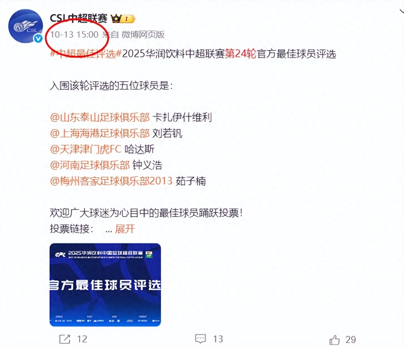 中超联赛官方终于公布第24轮最佳球员人选,瓦科当选,这是他连续两轮当选最佳球员,不过这次评选长达10天。射手榜上,瓦科继续领跑,不过优势只剩下一球,本轮泰山队对阵海港的比赛,他和莱昂纳多的射手王之争也是一个看点。