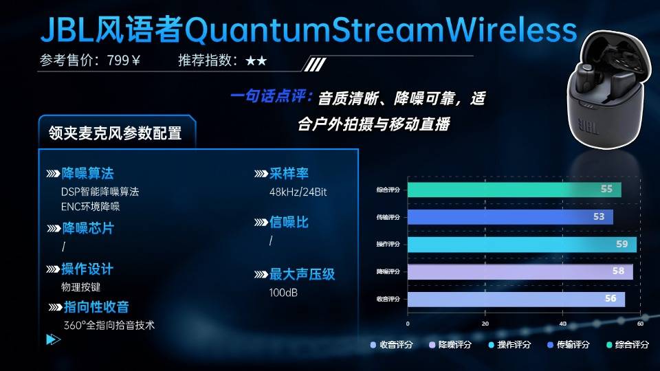总体来看,JBL 风语者 Quantum Stream Wireless兼具 音质、降噪和操作便捷性,适合移动拍摄、户外Vlog及直播创作者,是追求音质与便携平衡的实用无线领夹麦克风选择。