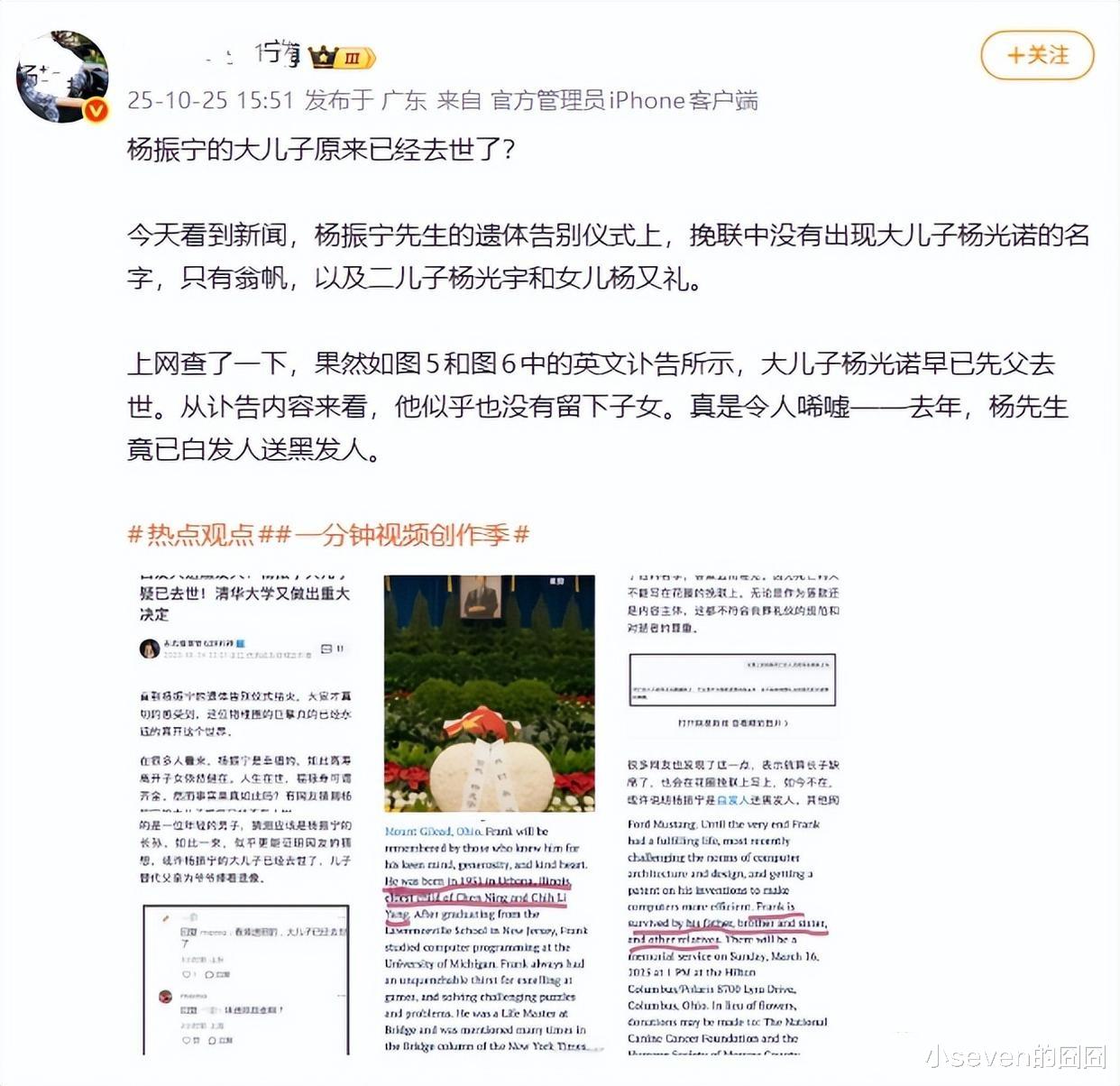 在10月25日的时候,有网友爆料杨振宁老先生的长子杨光诺于2024年年底就去世了,外网曾发布过讣告,同时也晒出了杨光诺的照片。