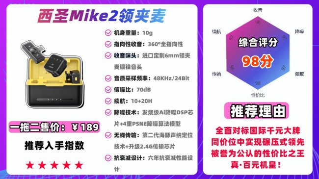 西圣多年来坚持“发烧级”产品理念,致力于打造音质卓越的麦克风。西圣Mike2采用加强版全指向AI感知麦克风,内置高品质进口定制6mm音头,搭配32位浮点数DSP芯片,配合4重PSNE降噪算法和自研RS™反馈抑制技术,实现98%的声音清晰度和96%的抗噪性。研发阶段,西圣邀请3000多位用户进行音质测试,确保产品性能卓越。因此,西圣Mike2堪称“百元级无线麦克风天花板”。