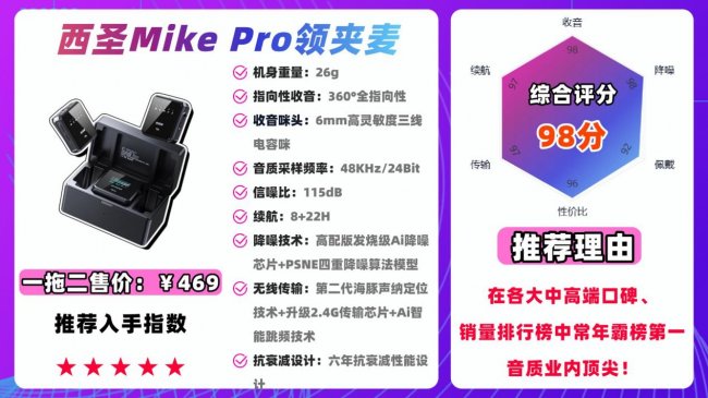 无线领夹麦克风怎么挑选?西圣Mike Pro麦克风凭借卓越的口碑、超高的性价比以及一流的音质,成为了专业麦克风领域的标杆产品。它在录音方面极为清晰,降噪效果也相当出色,因此深受生活分享者、主持人以及主播们的喜爱。而且这款价格不到千元的麦克风,却有着领先的配置,其音质能够媲美高端产品,远超竞品。