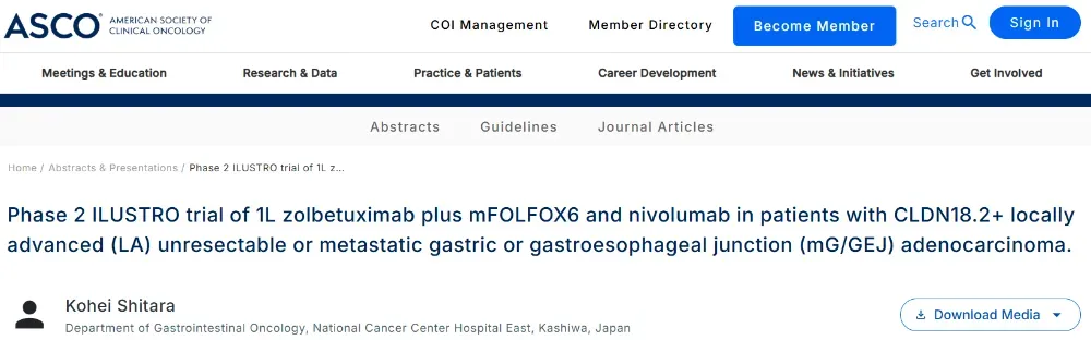 [1]SHITARA K, SHOJI H, FAZIO N, et al. Phase 2 ILUSTRO trial of 1L zolbetuximab plus mFOLFOX6 and nivolumab in patients with CLDN18.2+ locally advanced (LA) unresectable or metastatic gastric or gastroesophageal junction (mG/GEJ) adenocarcinoma. J Clin Oncol. 2026,44(suppl 4):LBA284.DOI:10.1200/JCO.2026.44.2_suppl.LBA284