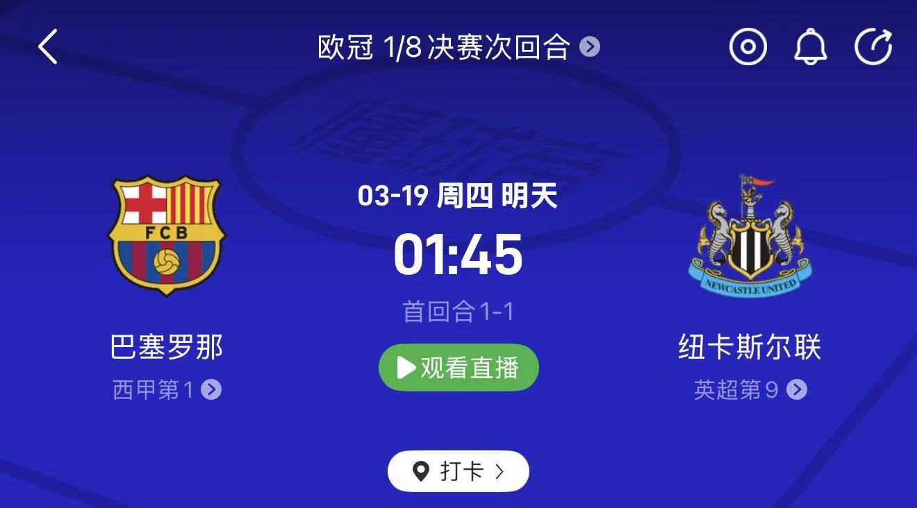 🔹 周三007 欧冠:巴塞罗那 vs 纽卡斯尔联(01:45)
