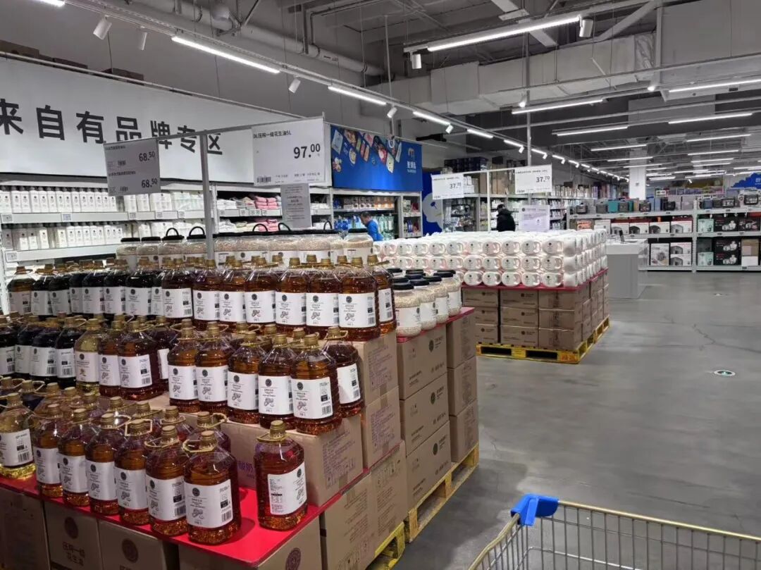 据《灵兽》观察,麦德龙四季青门店内,除了入口处摆放着胖东来的自有品牌商品之外,比如花生油、果汁、白酒、洗衣液等,其他购物区域几乎没有出现过胖东来的商品。