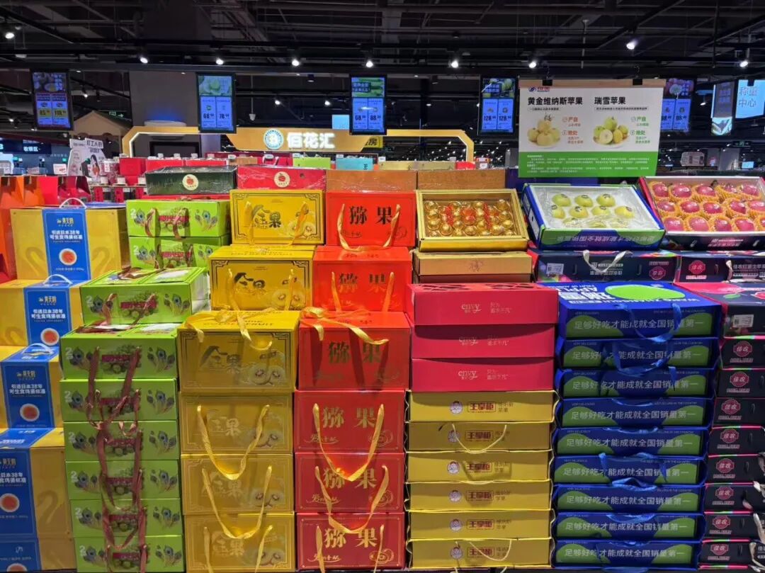 此外,从水果区来看,店内也上架了一些水果礼盒。128元一盒的脆密金柑礼盒、128元/盒的爱妃苹果礼盒、88元6个装的春见耙耙柑礼盒等。