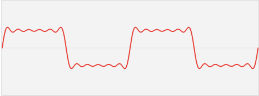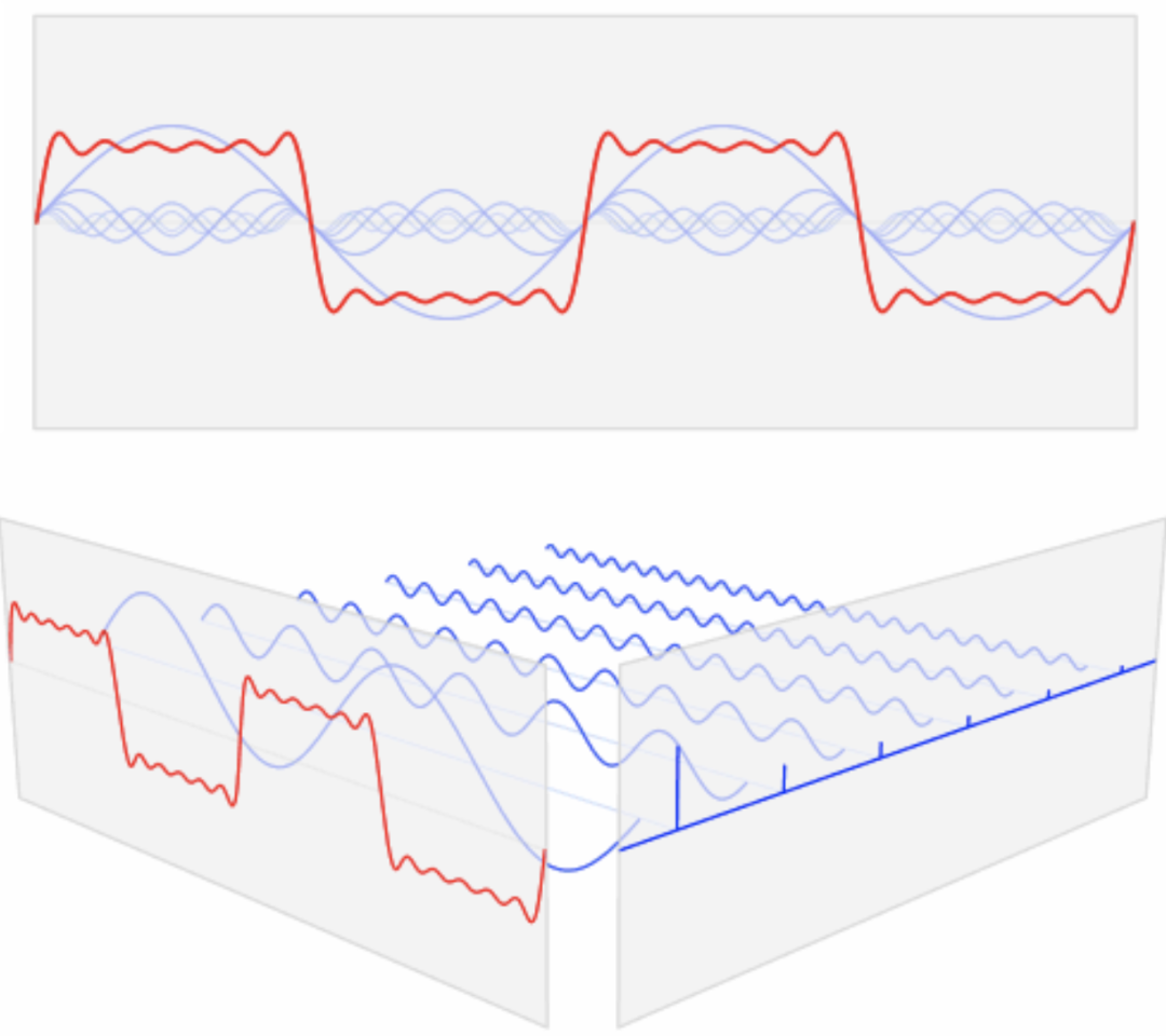 红色曲线 = 频率是100的蓝色曲线 × 0.5 + 频率是200的蓝色曲线 × 0.2 + 频率是300的蓝色曲线 × 0.1 + 频率是400的蓝色曲线 × 0.08 + ……