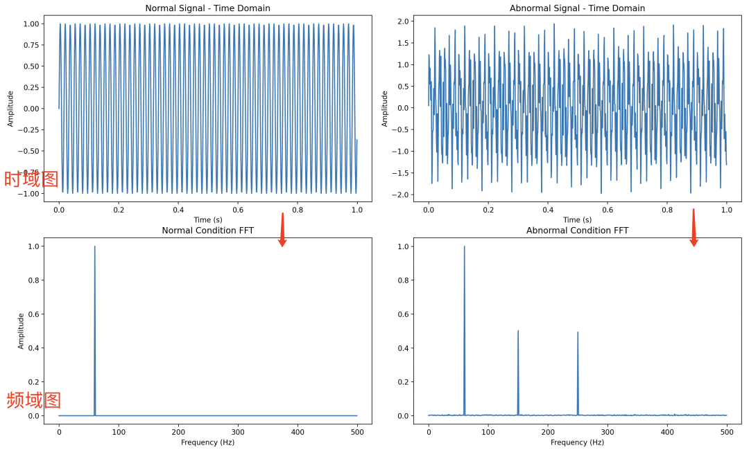 左边是正常减速机的数据对应傅立叶变换的数据分析,对应的频域图只有一个频率的噪音(当时这只是模拟数据,实际会比这个更复杂)