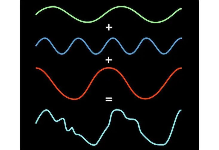 关键的洞见在于:复杂的震动可以看作是一系列简单震动的叠加。例如,上图中的复杂波形实际上是几个简单波动相加的结果,如下图所示: