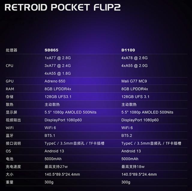 SOC 分别是之前 Retroid Pocket 5 和 Retroid Pocket 4 Pro 上使用的高通骁龙865和 MTK 天玑1100屏幕部分则延续了 Retroid Pocket 5上那块类 DC 调光5.5英寸 1920x1080 分辨率OLED 屏幕8GB RAM+128GB ROM主动散热、WiFi6、蓝牙5.1、耳机孔、TF 卡槽、USB Type-C 接口(支持视频输出)安卓13系统5000mAh 电池+27/18W 充电机身尺寸 140.5*89.5*24.4 mm ,重300克