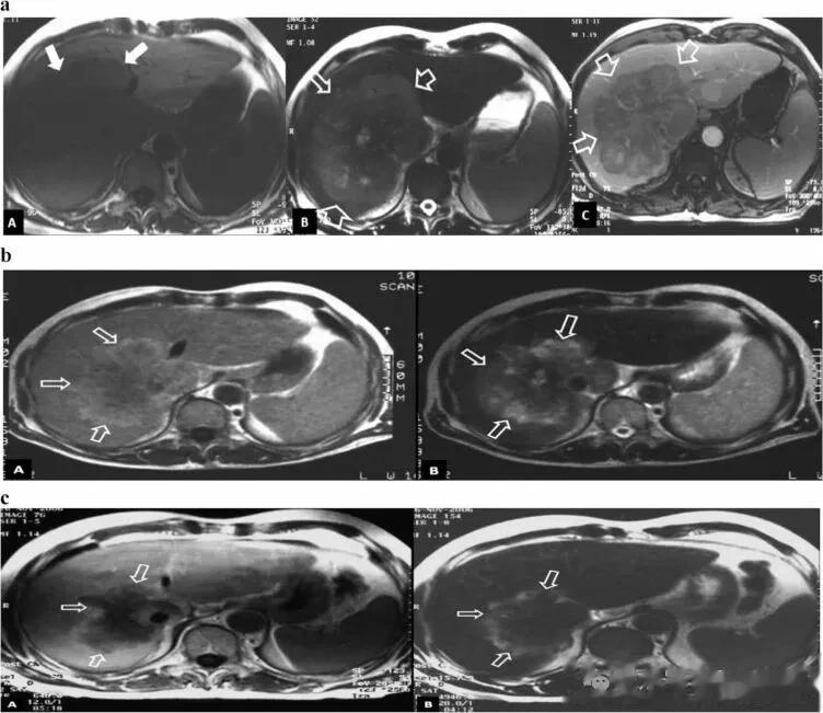 (a)接种前影像学研究。T1-w(A)、T2-w(B)和增强 T1-w(C)轴向磁共振 (MR) 图像显示肝肿瘤的初始大小(箭头)。