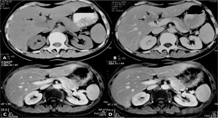 接种前平扫(A)及增强扫描(B,静脉注射造影剂的门静脉期)轴向CT图像显示门静脉前方低密度病灶(箭头)。治疗后(1年后)相同解剖层面的增强T1-w磁共振连续图像(C、D)显示肝实质外观正常。