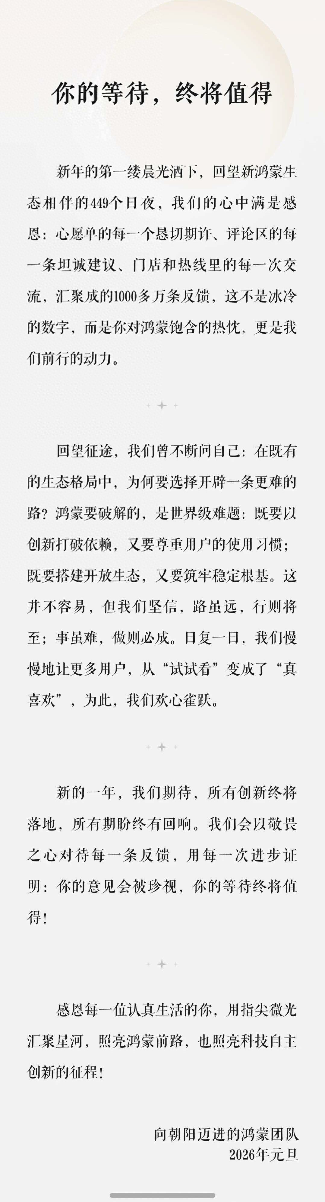 原来,选难走的路不是傻,而是为了把更好的体验留给我们。他们默默啃下技术的硬骨头,只为把流畅变成日常。谢谢鸿蒙团队的感谢!接下来的2026,我们继续携手共进吧~