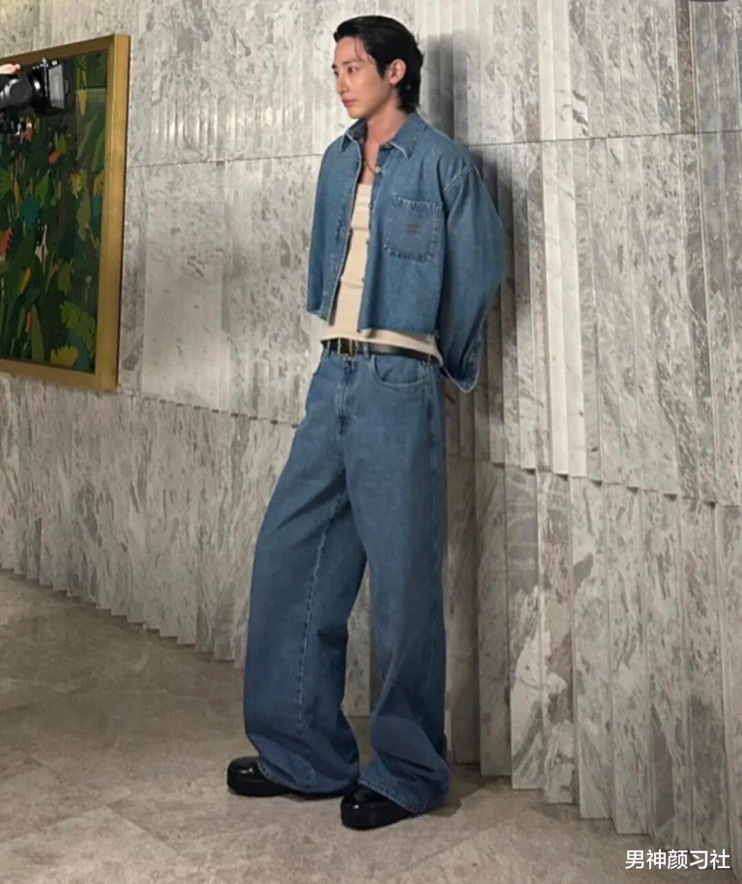 等天气稍微凉快一点,很多人又会穿上牛仔外套。不如看看李洙赫的选择吧,短款的更能凸显出人的比例。而且牛仔套装一起穿,因为内里的背心露出来,反而在一短一长之间更增加了层次感。