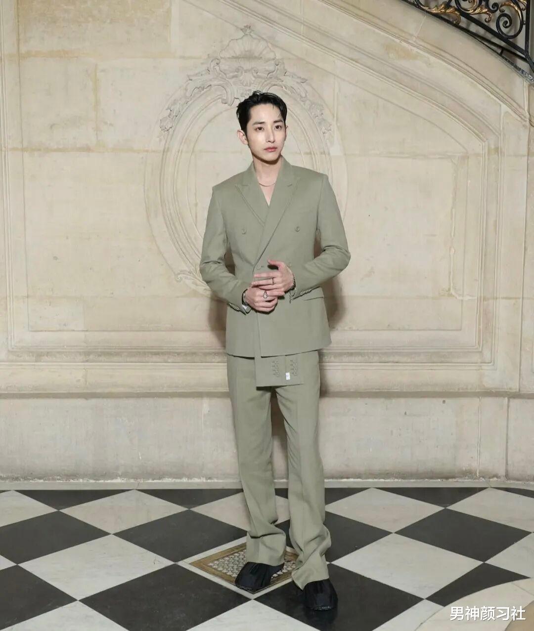 这套西装是他在看秀的时候穿的,也是很贴合他的风格。并且,为了不显得头重脚轻,他选了一双黑色的鞋子,能增加全身的质感,也是会让人看着比较年轻有为的。