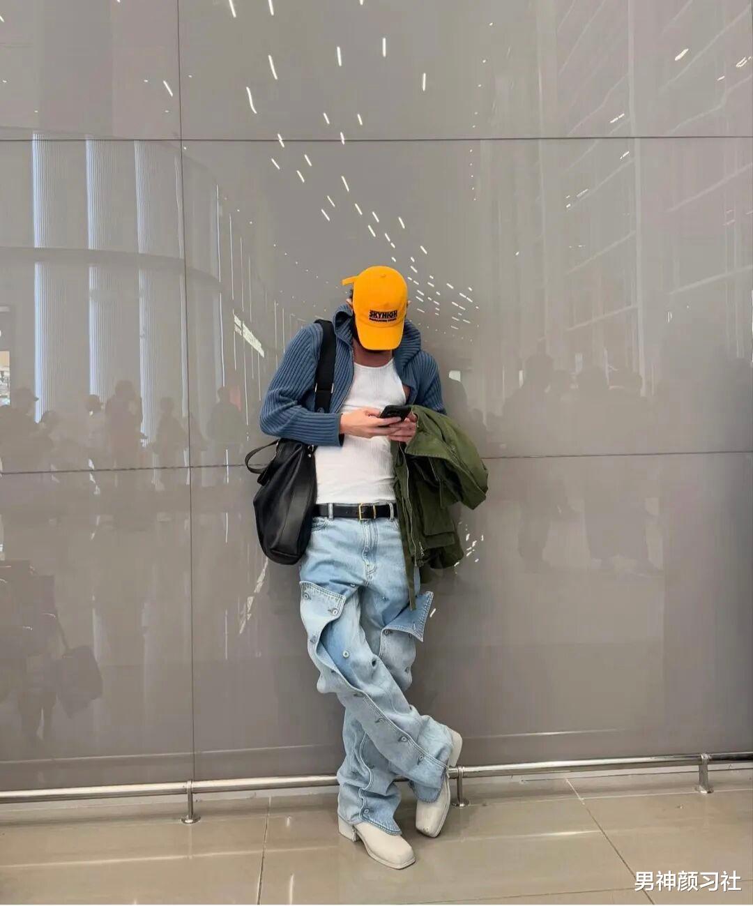 毛衣外套也可以玩出新花样,像他这样里面穿一件白色背心就太妙了,绝对是大多数男生不会去尝试的。但是你穿上去之后,很容易就能赢很大。在帽子的选择上,他照样也是用了一顶橘色的,去点亮全身的穿搭。