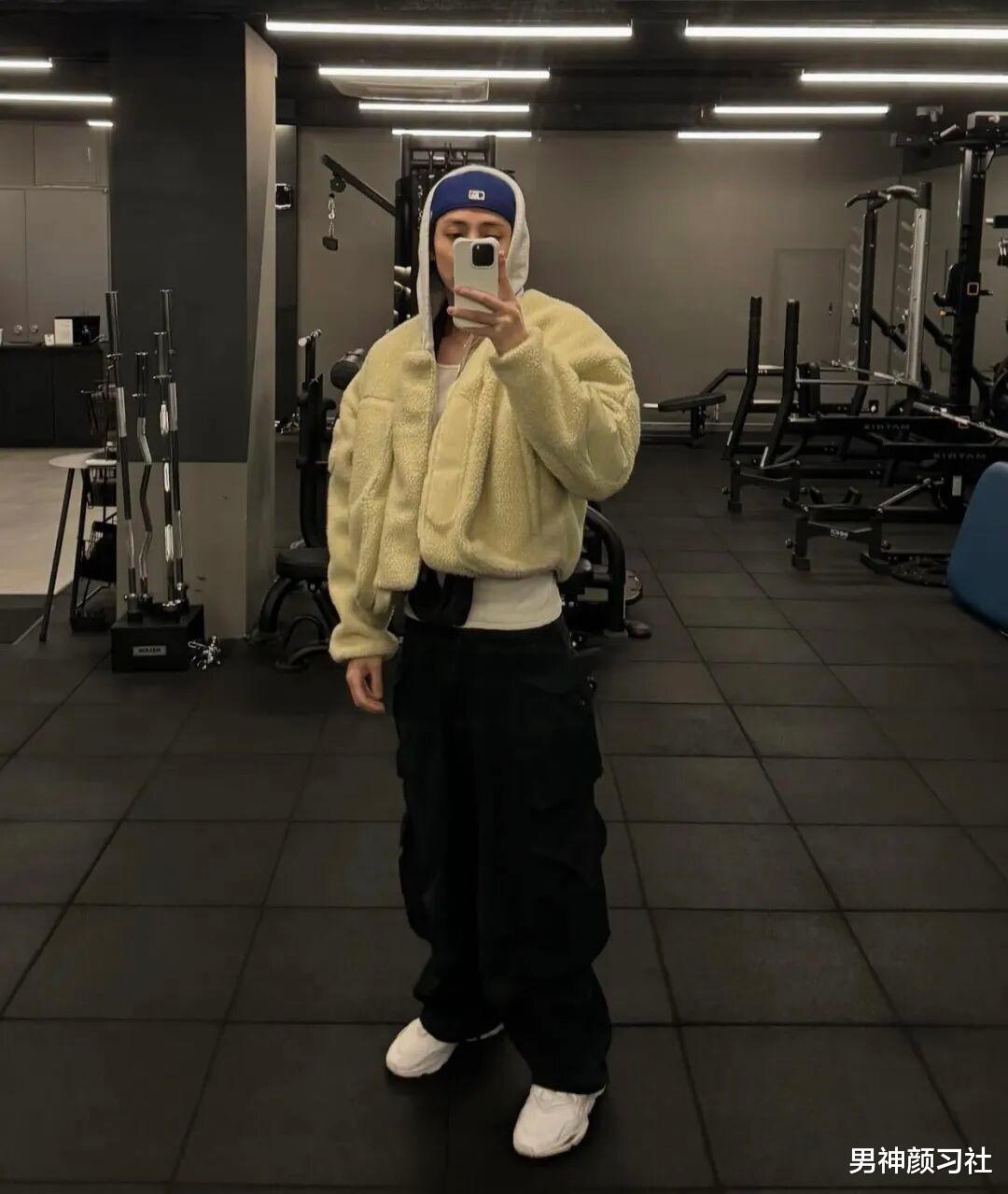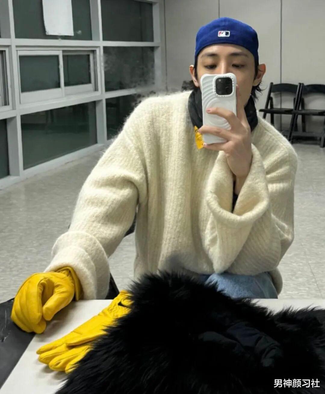 毛绒绒的毛衣也是这两年的主流,李洙赫的这件就非常有氛围感。他在营造暖男感的同时,也是用了亮色去点亮,比如一顶蓝色的帽子、一双黄色的手套,都能起到这样的作用。