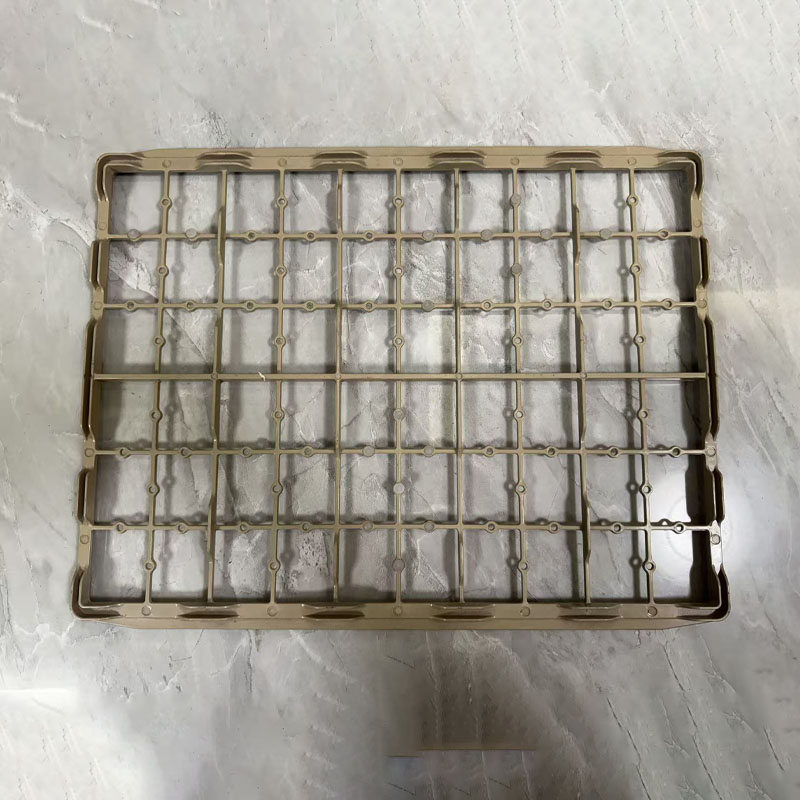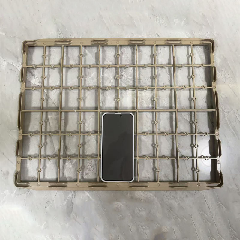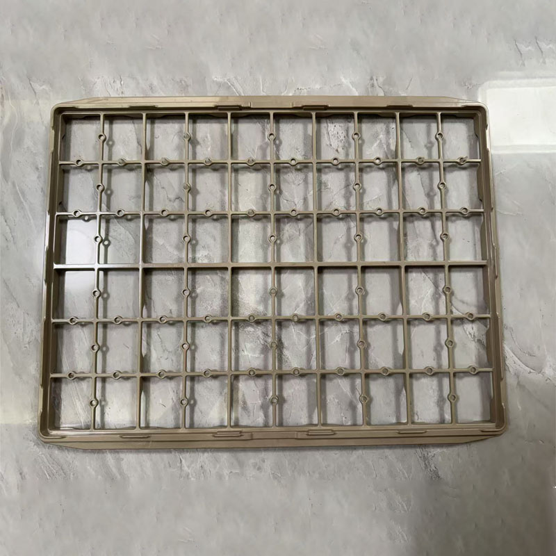 双优性能与烤盘设计深度融合,强化实用价值。标识层面采用高温烧结 + 防腐蚀双效油墨,经反复高温与酸碱清洗后,定位线、批次二维码仍清晰牢固,无脱落褪色,保障长期生产定位精度(误差≤±0.04mm)。结构上,一体化注塑的分区格子搭配低膨胀系数材质,高温下不翘曲、酸碱环境中不变形,挡边高度精准控制在 0.3mm-0.5mm,既固定工件又避免挤压损伤;底部通风孔经防腐处理,边缘光滑无毛刺,高温下可加速热风循环,酸碱清洗时不易残留污渍。