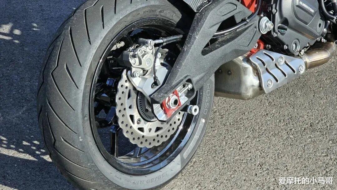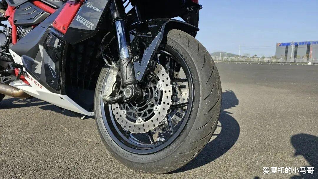 制动系统更不用多说,直接上了Brembo的四活塞卡钳+双碟刹,后单碟+双活塞卡钳的顶级组合。轮胎用的是倍耐力 DIABLO ROSSO 红魔轮胎,前 120/70 R15、后 160/60 R15,抓地力拉满,雨天湿滑路面也能给你足够的安全感。