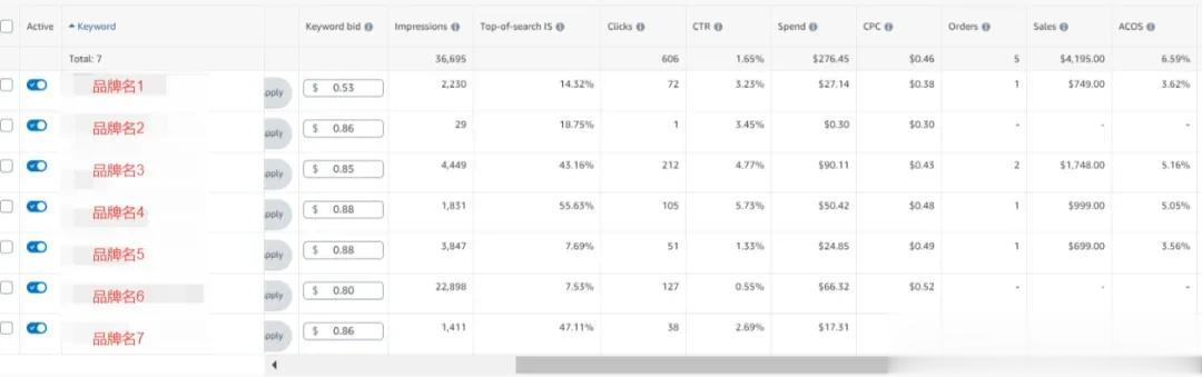 给大家看一个案例:近7天的数据, 广告投放的都是一些大牌的品牌名的广泛匹配。