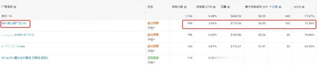 从案例中可以看到,低客单价标品的 SBV 点击成本为0.5,点击349次,带来155个订单,转化率44.4%,ACOS是13.36%。