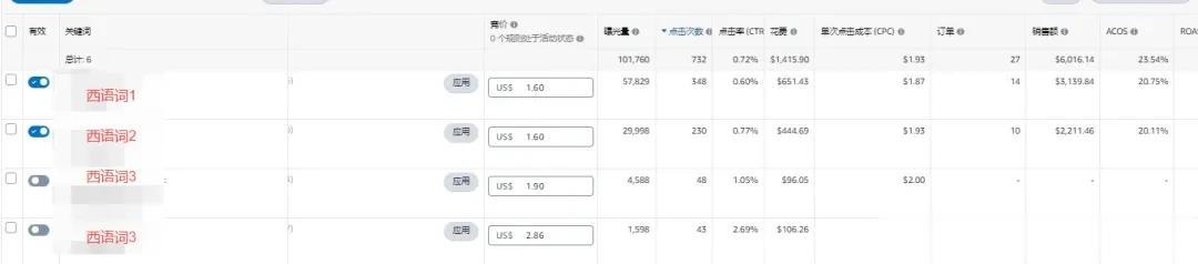 比如,我们1V1客户的一个产品在德克萨斯和弗洛里达州出单都占比不小,就专门开了西语词的广告组合: