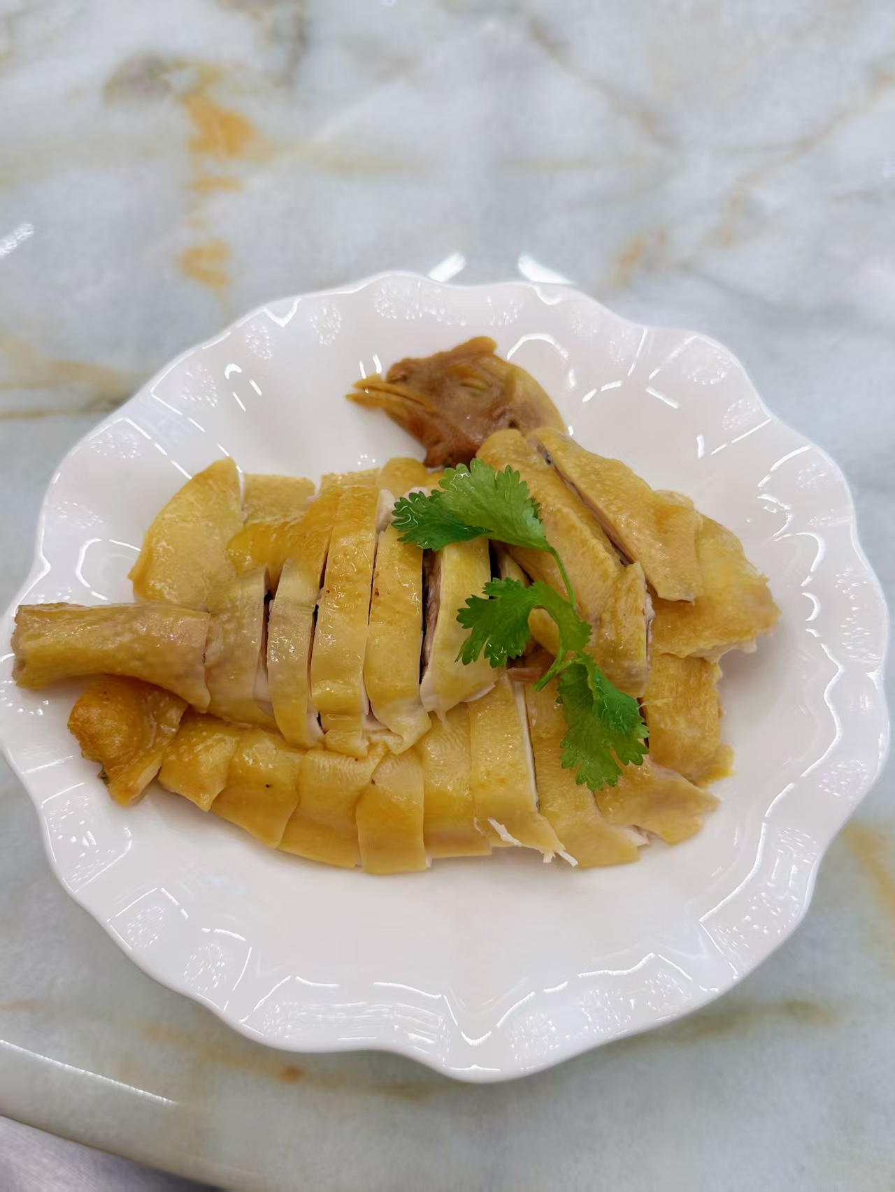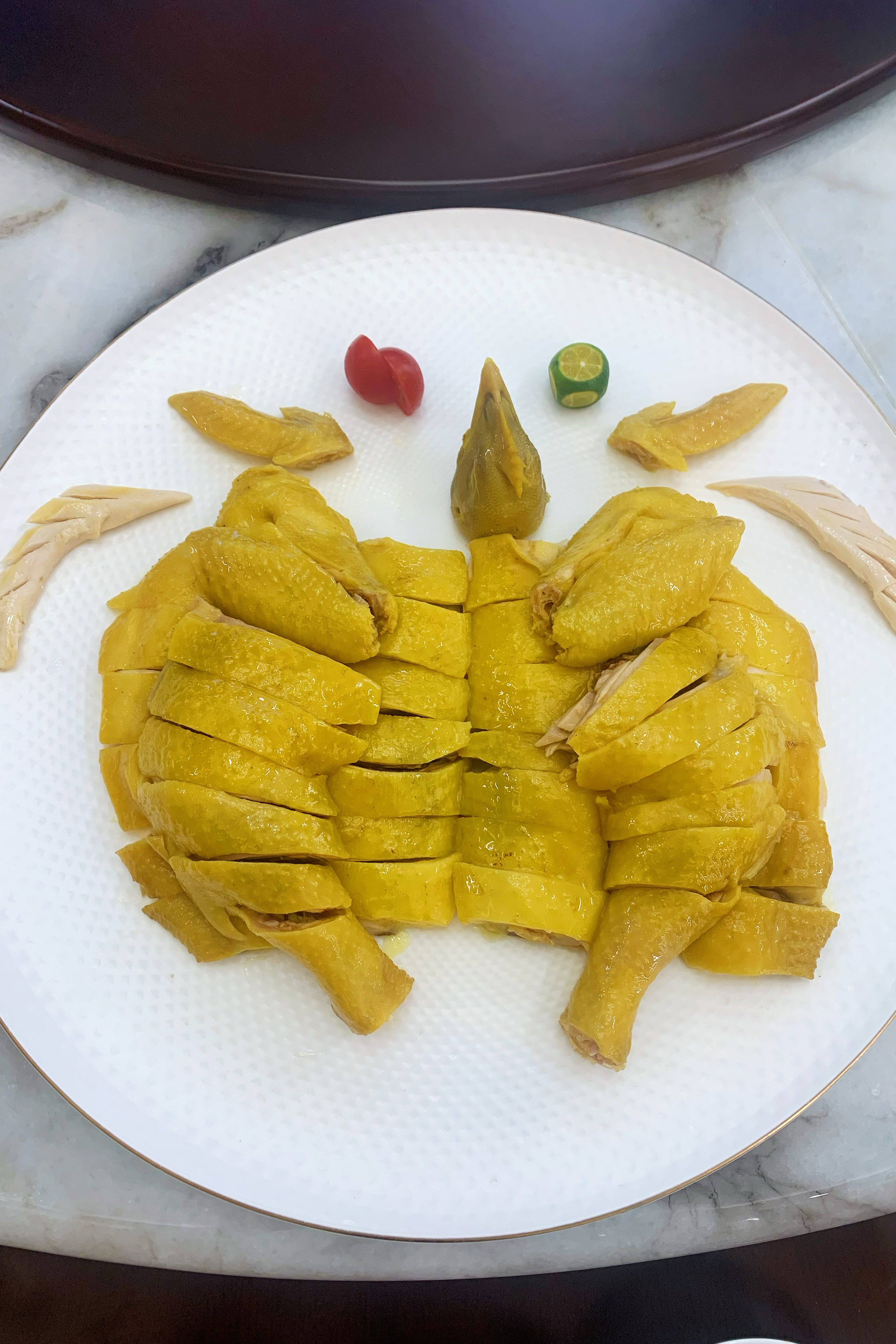 更绝的是它的烹饪过程,堪称一场“冰与火之歌”。在大厨的手中,鸡肉要经历90秒的沸水锁鲜,迅速投入冰水浴让鸡皮瞬间紧致,产生那层迷人的“咯咯”脆感,最后还要在45℃的高汤中慢浸至骨髓带着微微的粉红。这哪里是在做菜,分明是在对待一件艺术品!