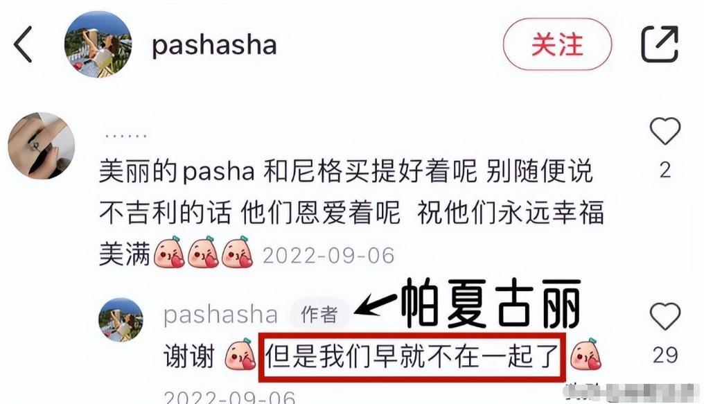 2022年,帕夏在个人社媒上回复网友自己已经和尼格买提离婚了,结束了近十年的婚姻。