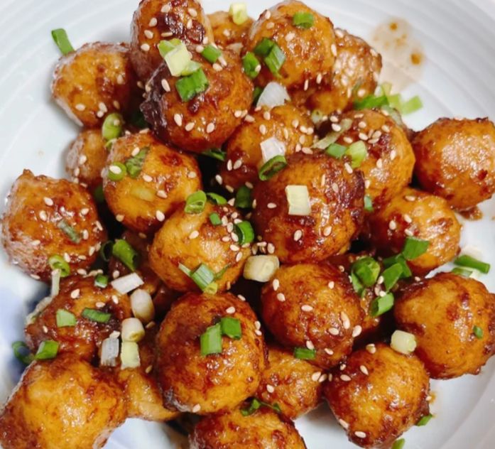 鱼丸煎好后,把调好的照烧汁倒进去,转大火烧开,再调成中小火慢慢收汁。期间用筷子或者铲子翻动鱼丸,让每一颗都均匀裹上酱色。等到汤汁变浓稠、能挂在鱼丸表面时,撒一把熟白芝麻进去翻两下就可以出锅了。有人还喜欢淋几滴香油,或者最后拌点葱花,看各人口味。刚出锅的照烧鱼丸,酱汁亮亮的,咬开是鱼丸本身的弹劲儿。要是当正餐的配菜,可以提前烫几根青菜垫在碗底,把鱼丸连汁浇上去;要是当追剧零食,用竹签串起来,倒一杯冰饮料,也挺自在的。剩的照烧汁别浪费,拌饭或者淋在煎蛋上,都不错。