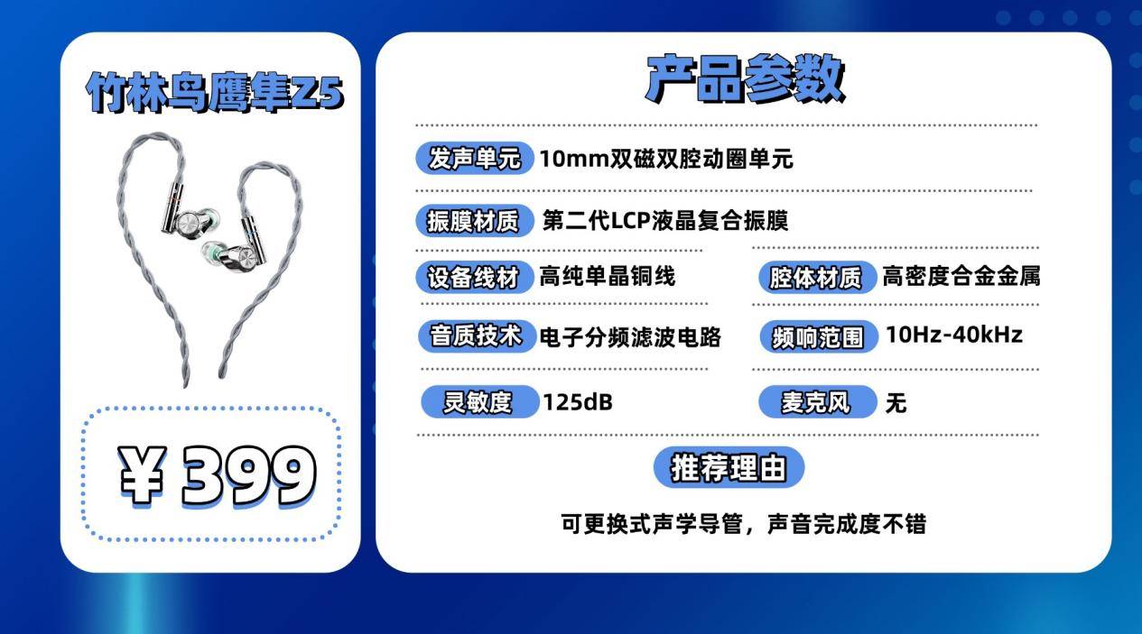 鹰 隼 Z5 采用 10mm 双磁双腔动圈单元,配合第二代 LCP 液晶复合振膜,整体调音偏向均衡耐听路线。高频延展自然,不刻意追求刺激感;中频人声干净,线条清楚,细节呈现比较完整;低频有厚度和弹性,但性格偏稳,不走猛烈下潜的路线,更适合长时间聆听。
