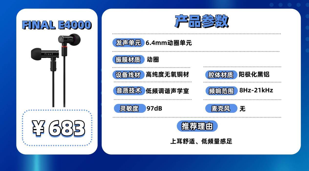 佩戴是 E4000 的优势之一。小体积腔体加上 Type E 硅胶耳塞,配合可微调角度的导管结构,对耳道的适配性很好,通勤或长时间聆听几乎不会产生压迫感,对耳型的挑剔程度也不高。配置方面采用无氧铜线材,做工偏向实用取向,耐用性不错;支持 MMCX 接口,后期更换线材或搭配不同前端都有一定空间。不足之处在于没有麦克风设计,如果有频繁通话需求并不算方便。整体来看,E4000 更适合偏好温润声音、重视佩戴舒适度、以及长时间听歌不易疲劳的用户。