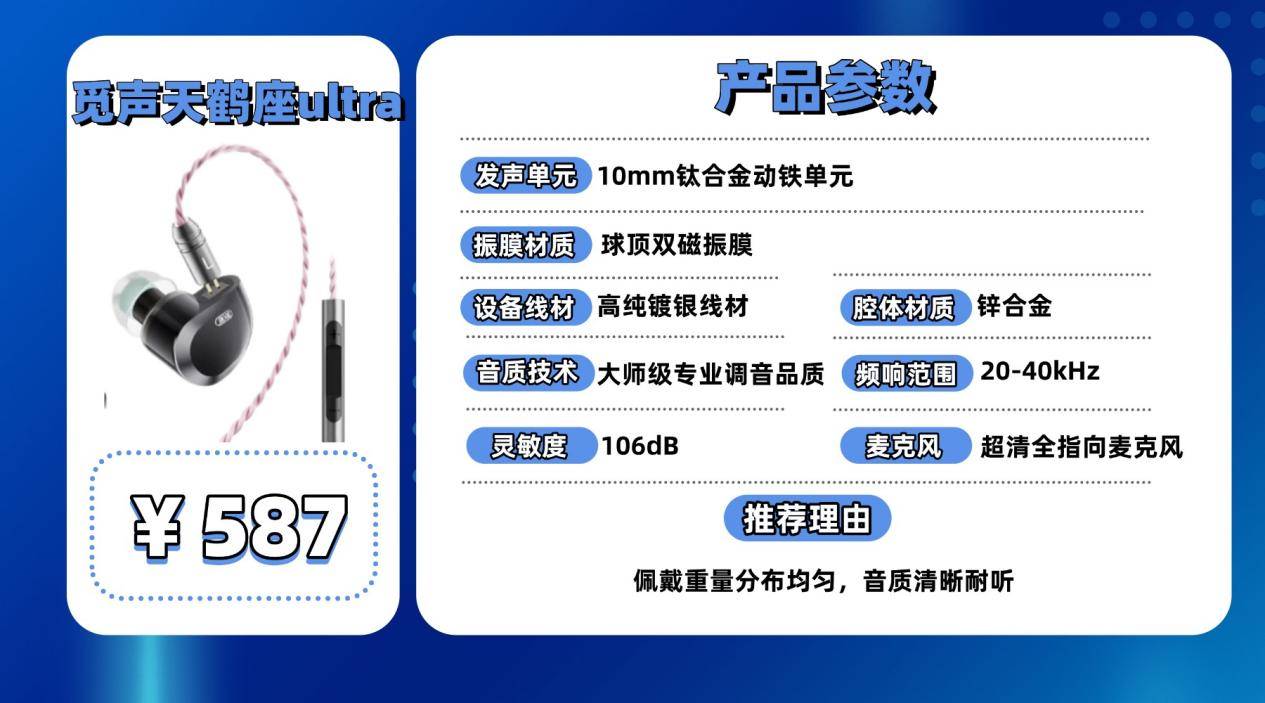 天 鹤 座 Ul tra 的调音方向比较明确,整体声音偏向清晰、干净,强调信息呈现而非氛围渲染。中高频通透度较好,人声轮廓清楚,乐器分布也较为有序。低频量感控制偏理性,不追求厚重冲击,更像是为整体结构服务,因此在长时间聆听时不容易产生疲劳感。不过对音源和前端输出有一定要求,搭配偏弱的设备时,细节表现可能会有所收敛。