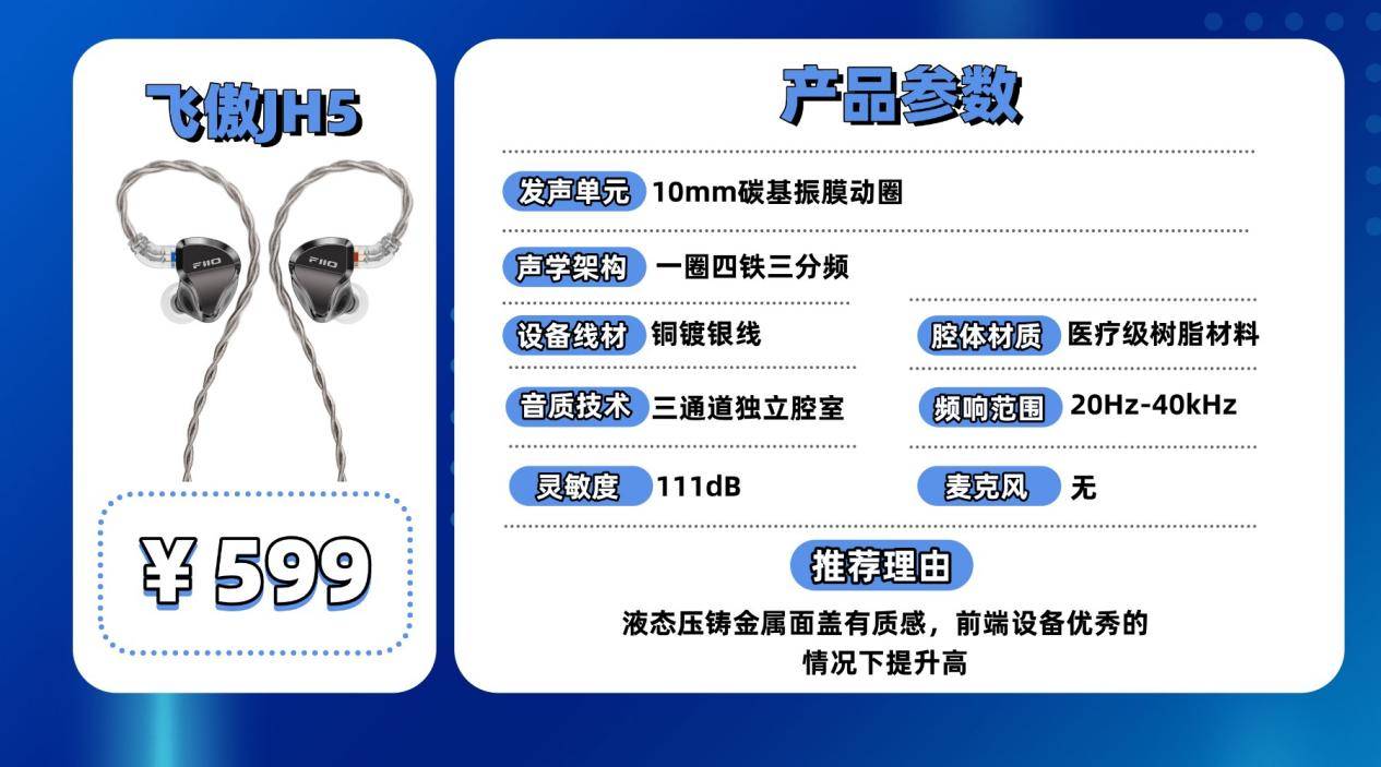 声音方面采用一圈四铁三分频结构,整体风格偏顺滑、自然。人声位置适中,听感平和,没有明显刺激感,高频控制较为克制,适合长时间聆听。低频量感不算突出,但衔接自然,不会抢戏。在编制复杂或节奏密集的曲目中,层次分离感略显保守,是它在声音表现上的主要短板。线材为四股铜镀银结构,支持 0.78mm 双针接口,后期更换空间较大。没有麦克风和线控设计,功能性偏向纯听音定位。整体而言,JH5 更适合重视佩戴舒适度、偏好温和听感的用户,如果对解析强度和外观细节要求不高,它是一款上手难度较低的选择。
